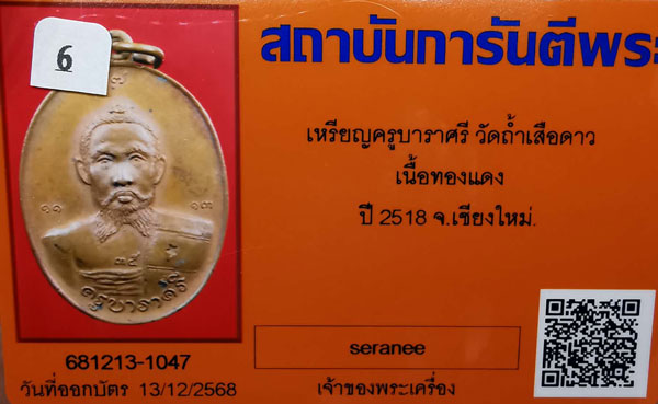 เหรียญครูบาราศรี วัดถ้ำเสือดาว เนื้อทองแดง ห่วงเดิม ปี2518 จ.เชียงใหม่ + บัตรG-pra สภาพเดิมค่ะ |