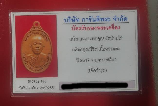 เหรียญหลวงพ่อคูณ วัดบ้านไร่ ปี ๒๕๑๗ เนื้อทองแดง บล็อคคูณมีขีดสวยมาก เดิมฯ พร้อมใบ g-pra
