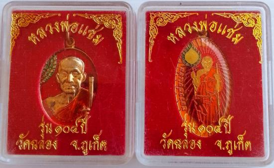 เคาะเดียวแดง.....เหรียญหลวงพ่อแช่ม วัดฉลอง จังหวัดภูเก็ต รุ่น 104 ปี เนื้อกะไหล่ทองลงยา รับจำนวน 2 รายการตามภาพ พร้อมกล่องเดิม