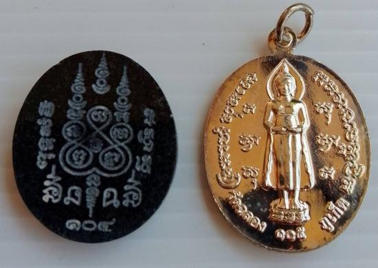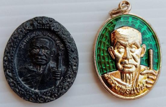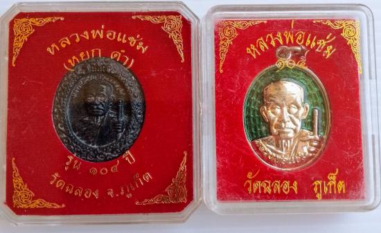 เหรียญหลวงพ่อแช่ม รุ่น 105 ปีเนื้อกะไหล่เงิน ลงยาเขียว และเหรียญหลวงพ่อแช่ม รุ่น 104 ปีเนื้อหยกดำ รับจำนวน 2 รายการพร้อมกล่องเดิม |