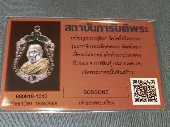 เคาะเดียว หลวงปู่ศิลา รุ่นมหาจักรพรรดิยอดรวย เหรียญปะฉลุนวะพรายทององค์เงิน หน้ากากเงินจีวรทองขอบเงินลงยา เลข 45 พร้อมใบเซอร์