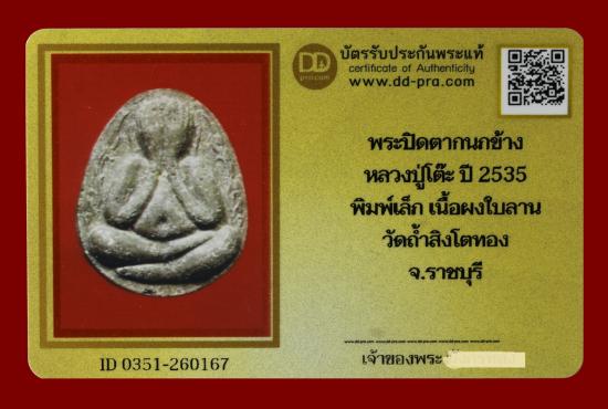 พระปิดตานกข้าง หลวงปู่โต๊ะ ปี 2535 พิมพ์เล็ก เนื้อผงใบลาน วัดถ้ำสิงโตทอง จ.ราชบุรี + บัตร