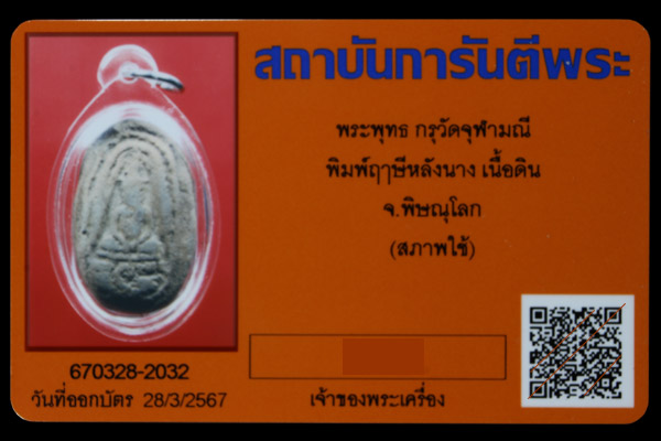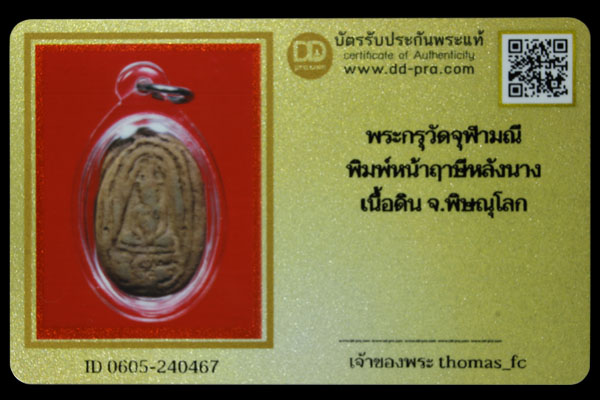 พระพุทธ กรุวัดจุฬามณี พิมพ์หน้าฤๅษีหลังนาง เนื้อดิน จ.พิษณุโลก พร้อมบัตรรับรองจากจีพระและบัตรเพื่อนบ้าน