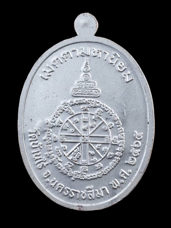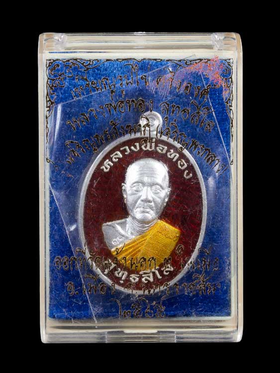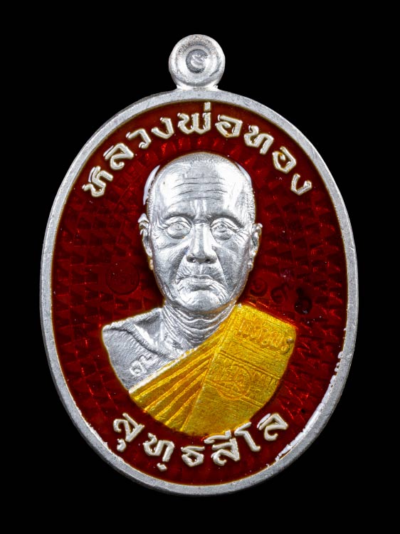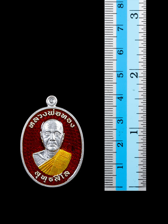 เหรียญรูปไข่ครึ่งองค์ หลวงพ่อทอง วัดบ้านไร่ จ.นครราชสีมา รุ่นเจริญพรสังฆาฏิ ( เจริญพรกลาง ) พ.ศ.2565 เนื้อเงินลงยา 2 สี ตอก 4 โค๊ต ตอกเลข กล่องเดิม