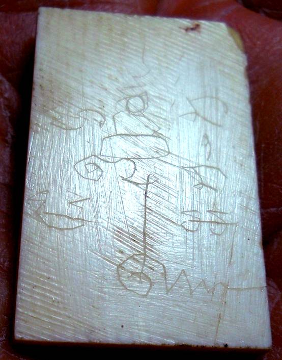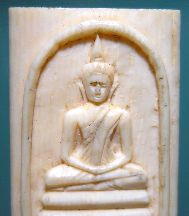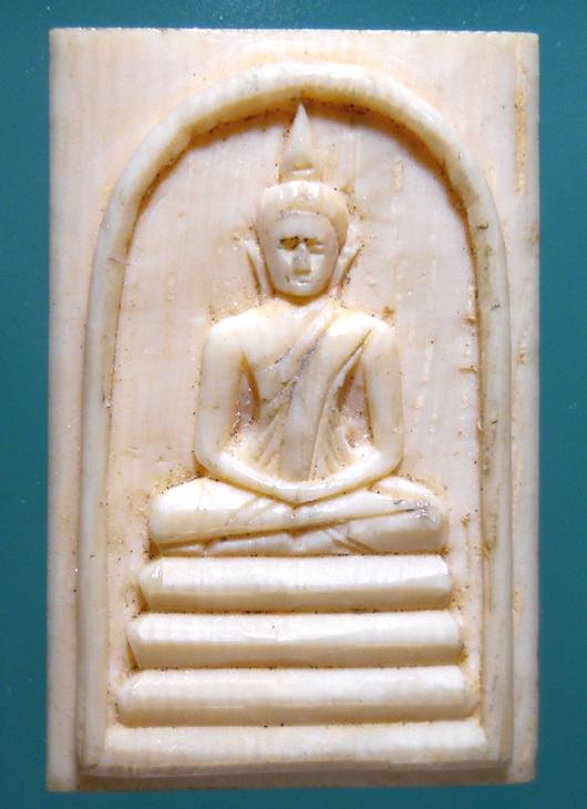 สมเด็จงาแกะหลวงพ่อกวยองค์นี้แกะได้สวย หน้าตาคมชัด ตาลึก จมูกโด่ง ด้านหลังมีอักขระยันต์ แบบจารเต็ม