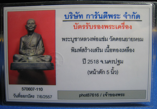พระบูชา หลวงพ่อแช่ม ปี2518 พิมพ์สร้างเสริม พร้อมบัตรรับรอง