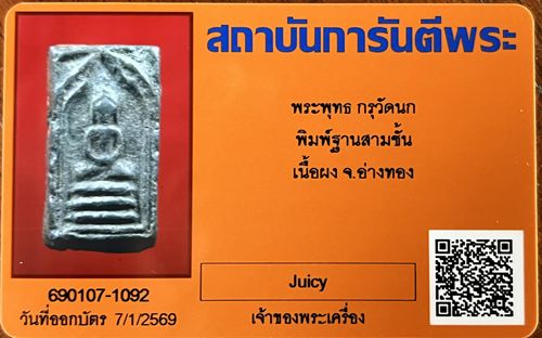 พระสมเด็จ พิมพ์ฐานสามชั้น กรุวัดนก (สกุณาราม) จ.อ่างทอง (หลวงปู่ศุข ปลุกเสก) + บัตรรับรอง G-PRA