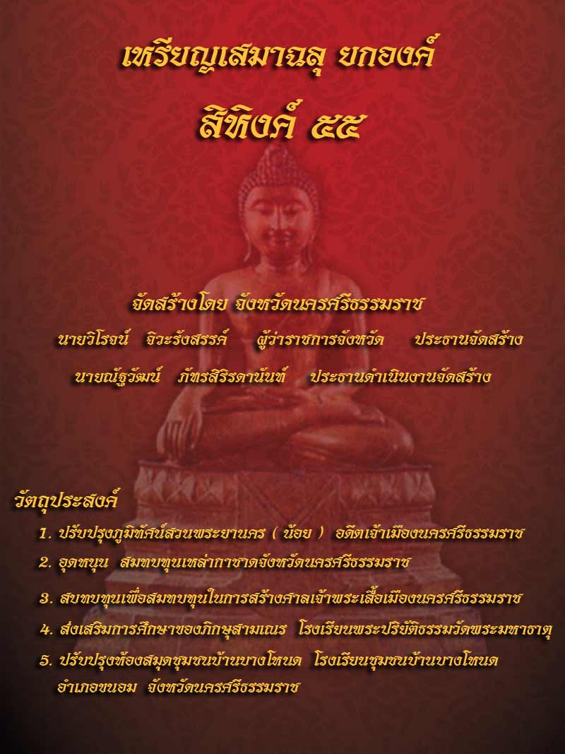 เหรียญเสมาฉลุยกองค์ พระพุทธสิหิงค์ รุ่นสิหิงค์ ๕๕ เนื้อเงินพ่นทรายลงยารักษาผิวอย่างดี พร้อมกล่องเดิมหมายเลข ๘๓ วัดพระมหาธาตุวรมหาวิหาร พ.ศ.๒๕๕๕