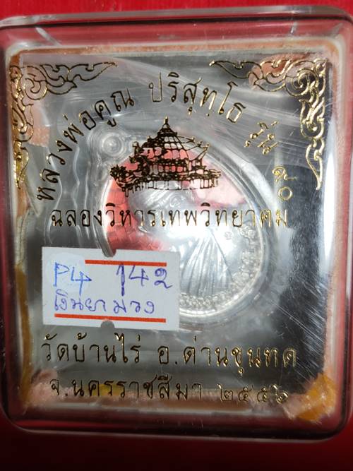 เหรียญหลวงพ่อคูณ ปริสุทโธ รุ่น ฉลองวิหารเทพ ออกวัดบ้านไร่ ปี 56 เนื้อ เงินลงยาสีมส้ม หมายเลข 142 เลี่ยมพร้อมใช้ เคาะเดียวแดง |