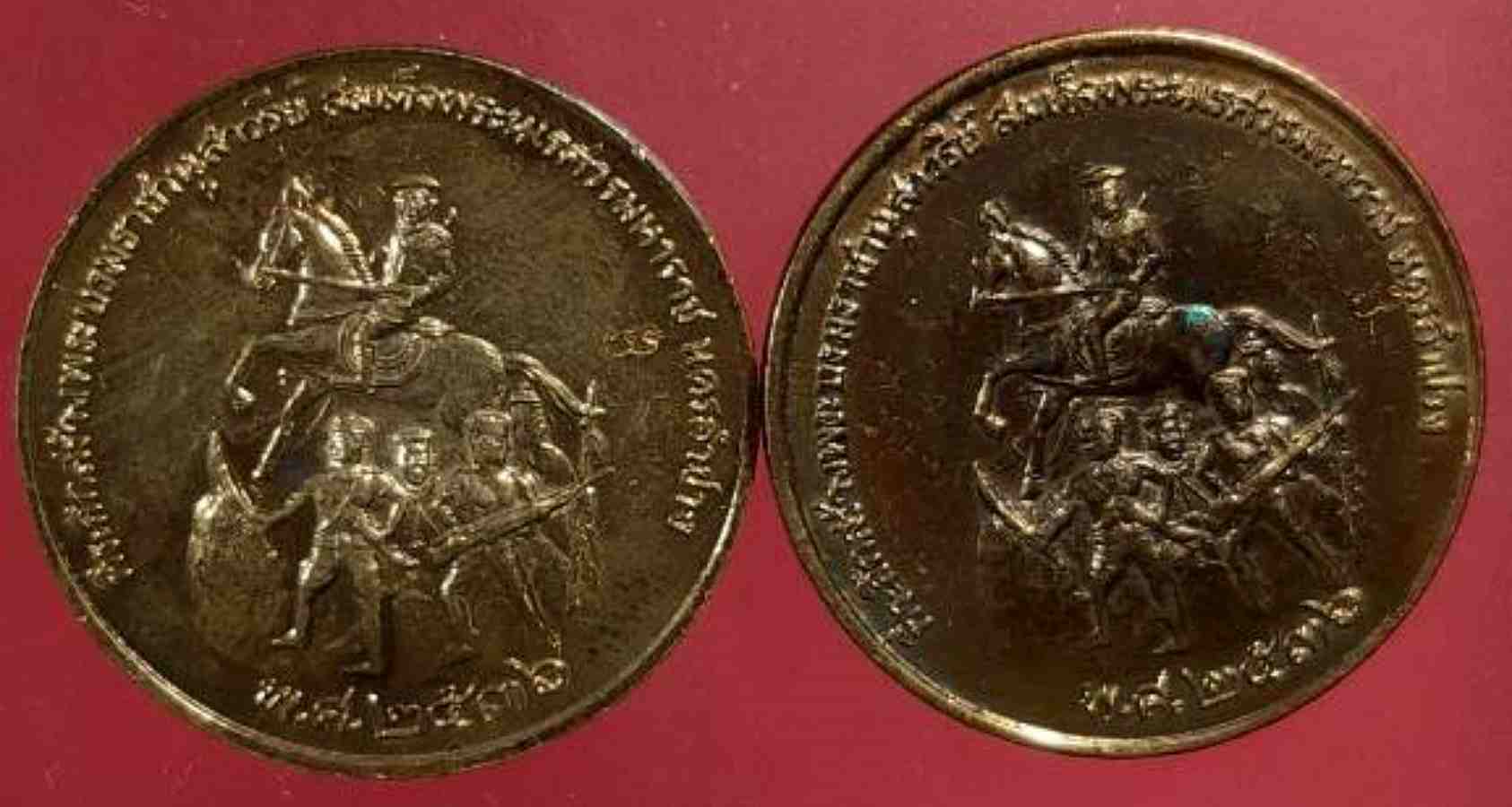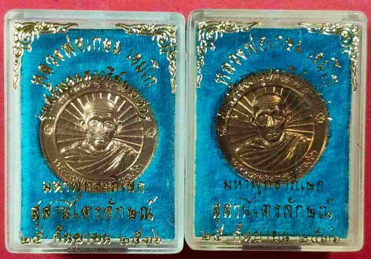เหรียญหลวงพ่อเกษม เขมโก หลังสมเด็จพระนเรศวรมหาราชออกศึก รุ่นสร้างอนุสาวรีย์นเรศวร ปี 2536 จำนวน 2 เหรียญ กล่องเดิม