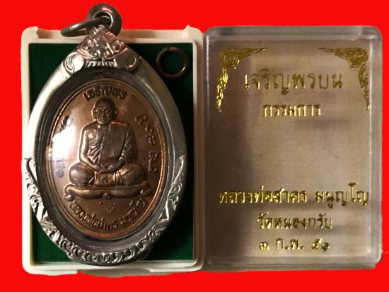 เหรียญเจริญพร ลพ.สาคร วัดหนองกรับ เนื้อทองแดง พร้อมเลี่ยม เลขสวย 518 (ตลับเงินครับ) วัดใจเคาะเดียวแดงครับ จบเท่าไรห่เท่านั้น