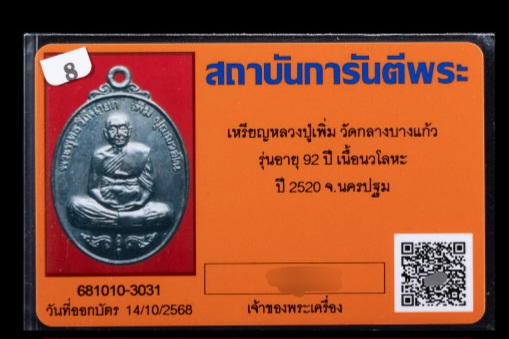 เหรียญสมัคร หลวงปู่เพิ่ม วัดกลางบางแก้ว นวโลหะ ปี20 พร้อมบัตรรับรอง สวยๆครับ