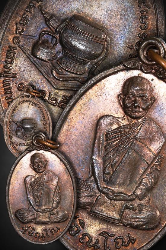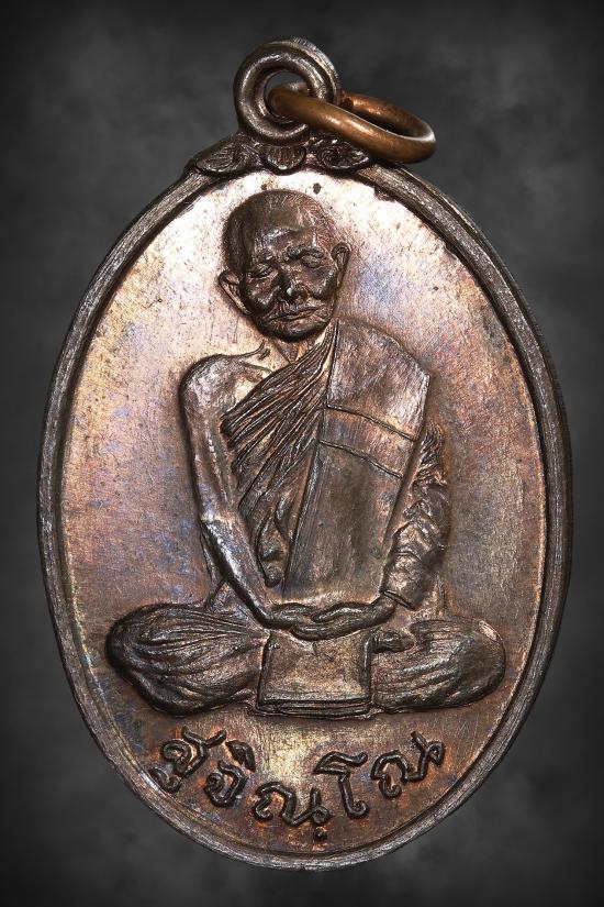 ด้านหน้ารูปหลวงปู่นั่งสมาธิเต็มองค์ห่มเฉียง พาดสังฆาฏิ จารึกฉายา "สุจิณโณ" ใต้หูห่วงมีลายดอกไม้