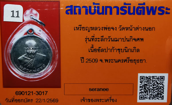 เหรียญหลวงพ่อจง วัดหน้าต่างนอก รุ่นที่ระลึกวันฌาปณกิจ เนื้ออัลปาก้าชุบนิกเเกิล ปี2509 จ.พระนครศรีอยุธยา + บัตรG-pra สภาพเดิมค่ะ