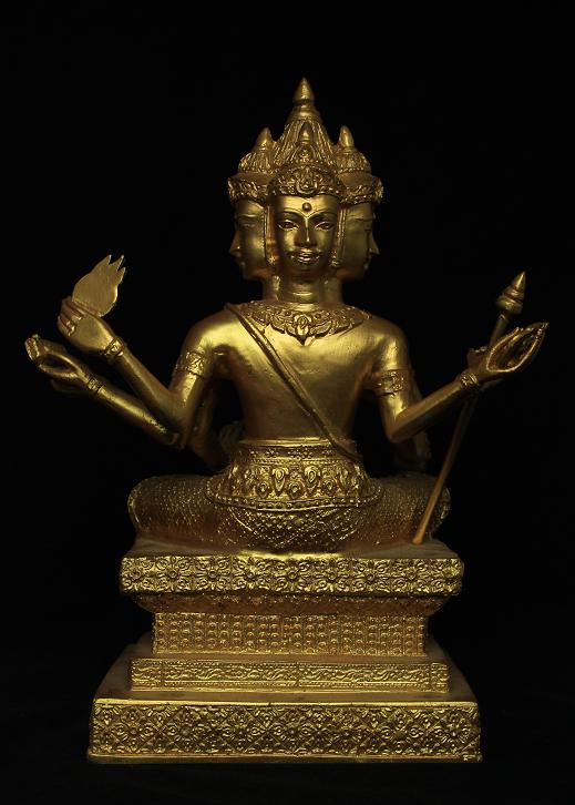 พระพรหมหรือท้าวมหาพรหมองค์นี้มาแบบใหญ่อลังการดีครับ องค์พระหล่อด้วยเนื้อทองผสมแล้วจึงนำมาปิดทองคำเปลว(ทองแท้)ที่ตัวองค์ และพระองค์นี้น่าจะไม่ใช้งานใหม่ๆทั่วๆไป พระน่าจะมีอายุพอสมควรเพราะดูได้จากกรรมวิธีในการหล่อ เนื้อโลหะ(ด้านใน)และความคมของงานปั้นแบบแล้วนำมาปิดทอง