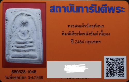 พระสมเด็จพระครูสุพจน์ วัดสุทัศน์ ปี 2484 (ปลุกเสกพิธีอินโดจีน) พิมพ์หลังยันต์ (นิยม) + บัตรรับรอง G-PRA