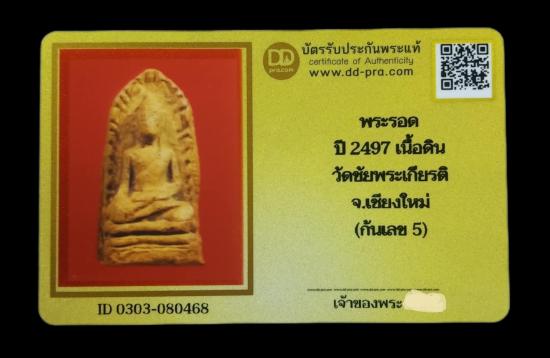 พระรอดวัดชัยพระเกียรติ เนื้อดิน ใต้ฐานจารเลข ๕ เนื้อดิน จ.เชียงใหม่ ปี 2497 พร้อมบัตรรับรอง