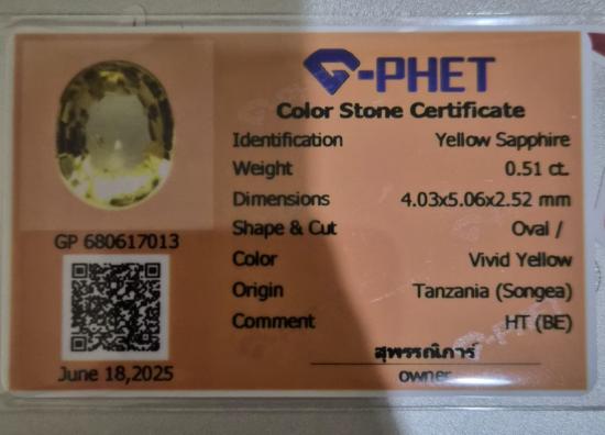 *เคาะเดียว* พลอยซองเกีย Yellow Sapphire สี Vivid Yellow ขนาดทำหัวแหวนผู้หญิง น่ารักๆ 0.51 กะรัต มีเซอร์Gphet