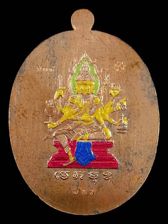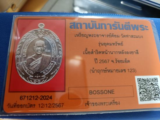 เหรียญรูปไข่ พิมพ์แกะสด รุ่น อุดมทรัพย์ ชุดทองคำนำฤกษ์ (เนื้อชนวนมวลสาร ๒๐๐ ล้าน) พระอาจารย์ต้อม วัดท่าสะแบง ร้อยเอ็ด เนื้อชนวน หน้ากากนาค หลังพรหม (ลงยา) หมายเลขเรียง ๑๒๓ (เลขเรียง) พร้อมกล่องเดิม พร้อมใบเซอร์