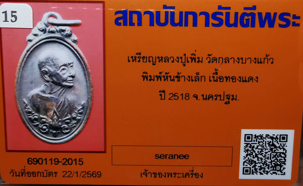 เหรียญหลวงปู่เพิ่ม วัดกลางบางแก้ว พิมพ์หันข้างเล็ก เนื้อทองแดง ห่วงเดิม ปี2518 จ.นครปฐม + บัตรG-pra สภาพเดิมค่ะ |