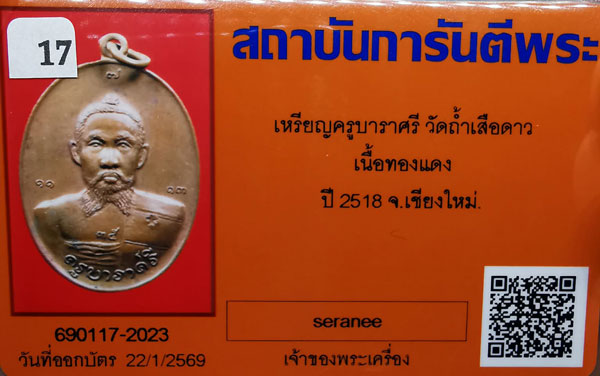 เหรียญครูบาราศรี วัดถ้ำเสือดาว เนื้อทองแดง ห่วงเดิม ปี2518 จ.เชียงใหม่ + บัตรG-pra สภาพเดิมค่ะ