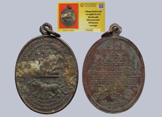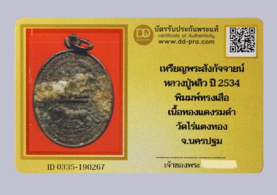 เหรียญพระสังกัจจายน์ หลวงปู่หลิว ปี2534 พิมพ์ทรงเสือ เนื้อทองแดงรมดำ วัดไร่แตงทอง จ.นครปฐม+ บัตรดีดี