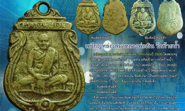 เหรียญหล่อเสมาหลวงพ่อเงิน วัดท้ายน้ำสร้างก่อน ปี2500 ถือเป็นเหรียญหล่อเสมาหลวงพ่อเงินรุ่นแรก ลักษณะการหล่อศิลปะนูนต่ำเนื้อทองผสม งดงามตามแบบสมัยช่างยุคนั้น มีทั้งพิมพ์หลังยันต์สี่ และยันต์ห้า จำนวนสร้างไม่ชัดเจน แต่พบเห็นน้อยมาก