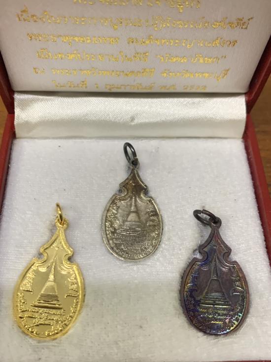 ชุดเหรียญพระบาทสมเด็จอมเกล้าเจ้าอยู่หัว รัชกาลที่ 4 เนื่องในวาระการบูรณะปฏิสังขรณ์องค์พระธาตุจอมเพชร ปี 2532 ประกอบด้วย เนื้อเงิน เนื้อทองแดง เนื้อกะไหล่ทอง เกจิดังทั่วเมืองเพชรร่วมปลุกเสกพิธีใหญ่ สภาพสวยพร้อมกล่องเดิม