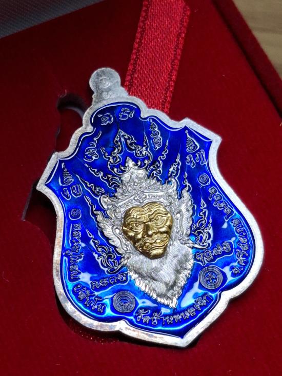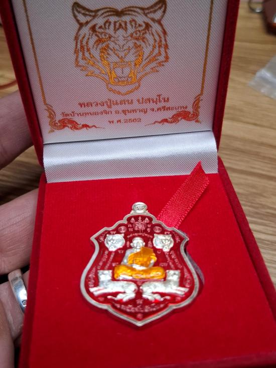 เหรียญพยัคฆ์ปสันโน หลวงปู่แสน วัดบ้านหนองจิก เนื้อเงินลงยาแดง หน้ากากทองคำด้านหลัง เลข 66