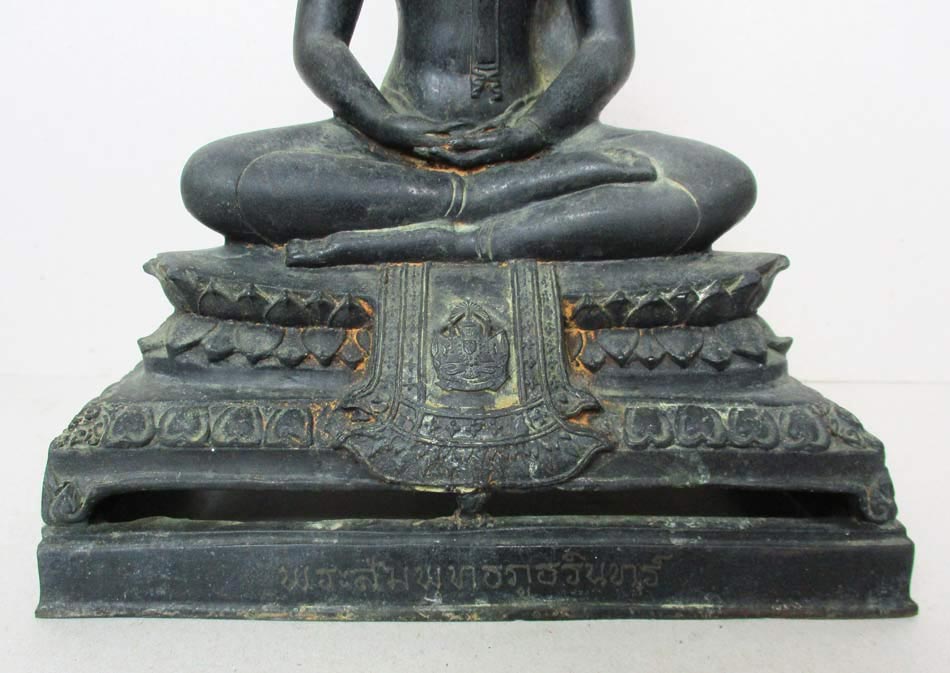 พระสัมพุทธภูธรินทร์ พระบูชารุ่นแรกของกรมตำรวจ ในหลวงรัชกาลที่ 9 เสด็จเททอง พ.ศ.2516 หน้าตัก 5 นิ้ว เนื้อโลหะรมมันปูผิวหิ้ง ดินไทยสีดำ-แดง ตอกโค๊ต ตอกเลข หายากครับ !!