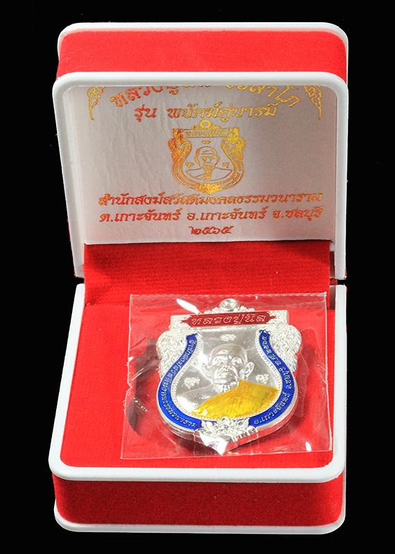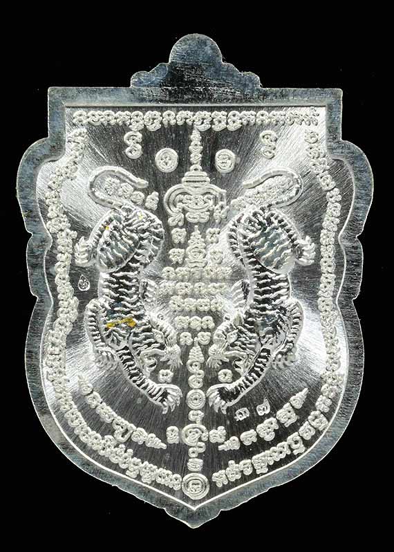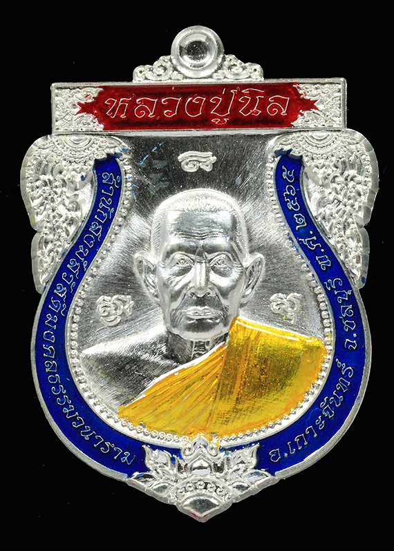 เหรียญเสมา รุ่น พยัคฆ์คู่บารมี หลวงปู่นิล วรลาโภ สำนักสงฆ์สวัสดีธรรมวนาราม จ.ชลบุรี พ.ศ.2556 เนื้อเงินลงยาสี ตอกโค๊ต ตอกเลข นอนกล่องเดิม !!