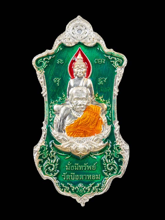 เหรียญท้าวเวสสุวรรณ พระครูอนุวัตรบวรกิจ วัดบึงตาหอม จ.ฉะเชิงเทรา พ.ศ.2563 เนื้อเงินลงยาสีเขียว 2 หน้า สภาพสวยพร้อมกล่องเดิม