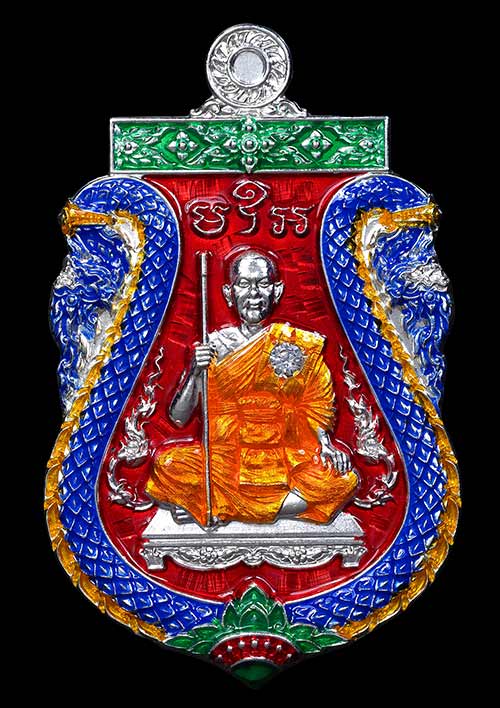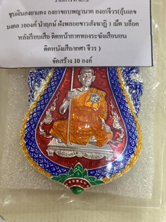 1 ใน 10 เหรียญเสมาพญาเสืออุดมทรัพย์ พระอาจารย์ประสูติ (หลวงพ่อประสูติ) วัดในเตา จ.ตรัง เนื้อชุบเงินลงยาแดงลงยาขอบพญานาคลงยาจีวร ฝังพลอยขาว บล็อคหลังเรียบเสือติดหน้ากากทองระฆังเสือ เลขสวยหลักเดียวNO.7