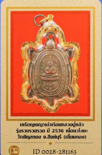 เหรียญพญาเต่าเรือน หลวงปู่หลิว รุ่นรวยรวยรวย เนื้อนวะโลหะ ปี2536 วัดไร่แตงทอง จ.นครปฐม พร้อมบัตรรับรองครับ (ไม่มีทองแล้วนะครับ)
