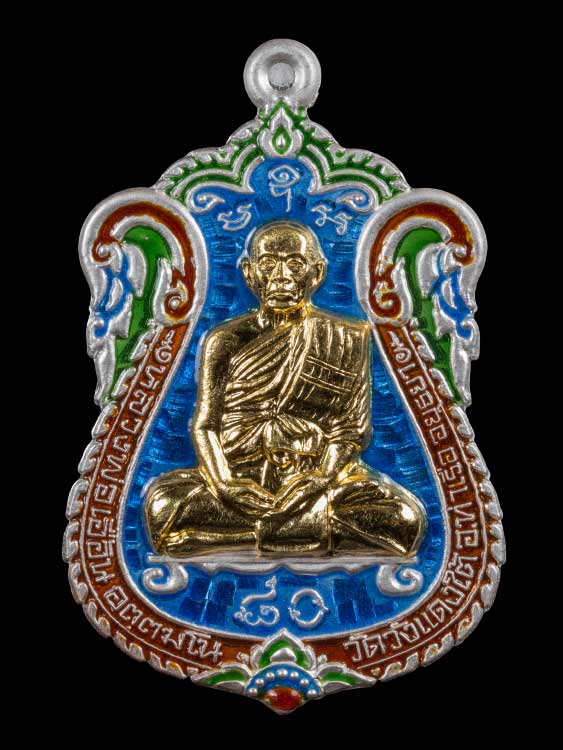 เหรียญเสมารูปเหมือน หลวงพ่อเอื้อน วัดวังแดงใต้ จ.อยุธยา รุ่น มหาเศรษฐี ๘๐ หลังหนุมาน 8 กร ขี่สิงห์ พ.ศ.2563 เนื้อเงินลงยาสี หน้ากากทองคำ ตอก 3 โค๊ต ตอกเลข สภาพสวยกริ๊บ !!