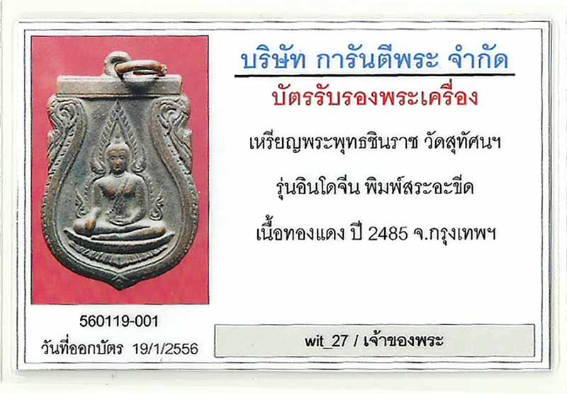 เหรียญพระพุทธชินราชอินโดจีน ปี 2485 พิมพ์สระอะขีด เนื้อทองแดงรมดำ วัดสุทัศน์ฯ กรุงเทพฯ พร้อมบัตรรับรอง g-pra...