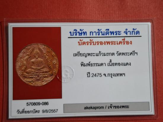 เหรียญพระแก้วมรกต วัดพระศรี ฯ ปี2475เนื้อทองแดง พร้อมใบรับรอง G-pra