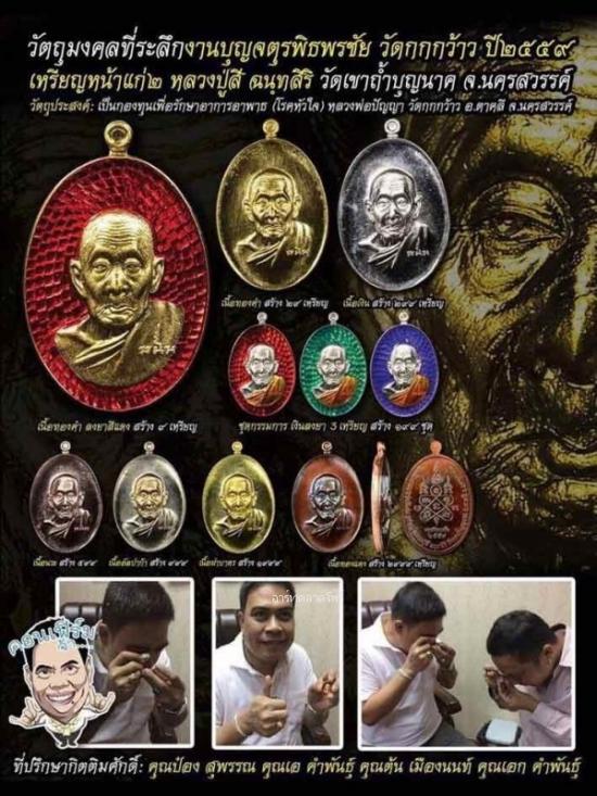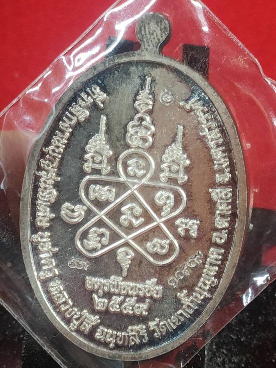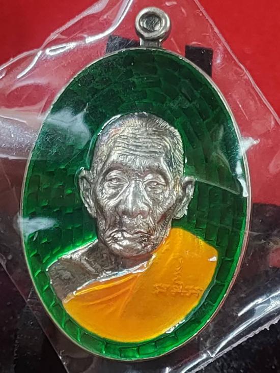 เหรียญพิมพ์หน้าแก่๒ หลวงปู่สี ฉนฺทสิริ วัดถ้ำเขาบุญนาค รุ่นพิเศษบูชาครู ปี ๕๙ ออกในงานพิธีจตุรพิธพรชัย วัดกกกว้าว จ.นครสวรรค์ เนื้อเงิน ลงยาเขียว ลงยาจีวร แยกขุดกรรมการ เลข199 ไม่มีกล่อง