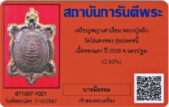 เหรียญพญาเต่าเรือน หลวงปู่หลิว วัดไร่แตงทอง รุ่นปลดหนี้ เนื้อทองแดง ปี 2536 จ.นครปฐม ตอกโค้ดคมๆ พร้อมบัตรรับรอง G-Pra เลี่ยมทอง G 63% ท่านที่ชอบของสวยๆ เก็บยาวๆมีกำไรแน่นอนครับ
