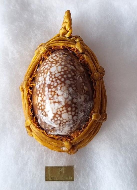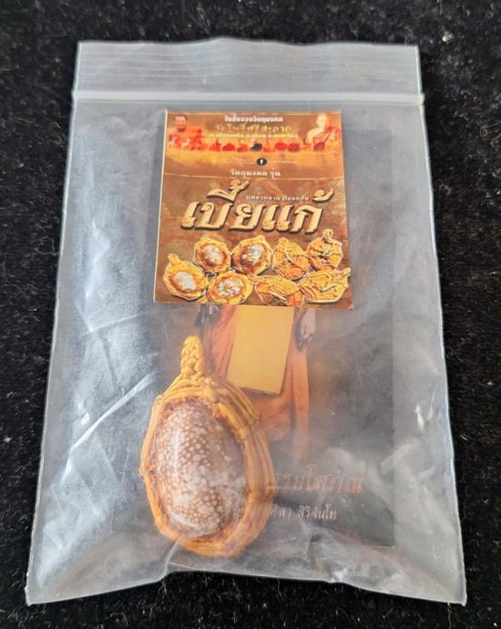 เบี้ยแก้ หุ้มจีวร ถักเชือก หลวงปู่ศิลา วัดโพธิ์ศรีสะอาด มีแผ่นเลขกำกับ ฝังตะกรุดทองเหลือง พร้อมใบคาถา ปี2567 |