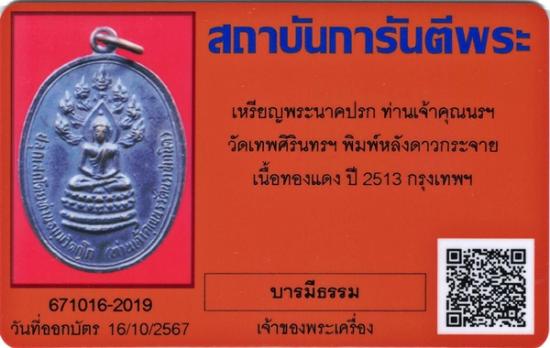 เหรียญนาคปรกจเร เจ้าคุณนร วัดเทพศิรินทร์ ปี 2513 บล็อคดาวกระจาย ก้อนเมฆ นิยม สวยๆพร้อมบัตรฯ