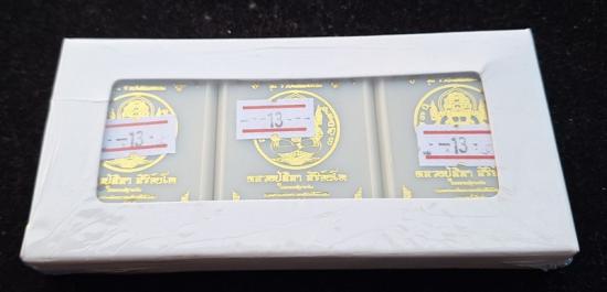 หลวงปู่มหาศิลา สิริจันโท พระปิดตาพังพระกาฬ รุ่นรวยโชคอนันต์ ชุดกรรมการลงยา3เหรียญ ไม่แกะซีลลุ้นเลขสวย