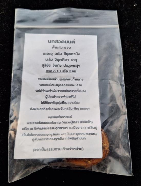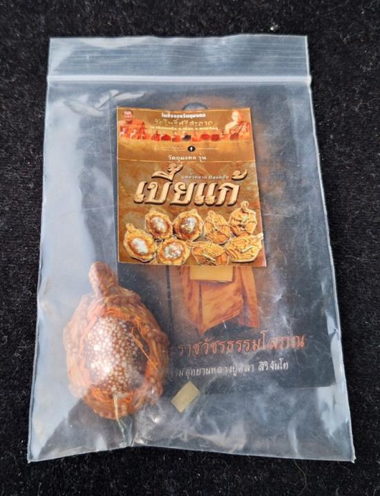 เบี้ยแก้ หุ้มจีวร ถักเชือก หลวงปู่ศิลา วัดโพธิ์ศรีสะอาด มีแผ่นเลขกำกับ ฝังตะกรุดทองเหลือง พร้อมใบคาถา ปี2567 |