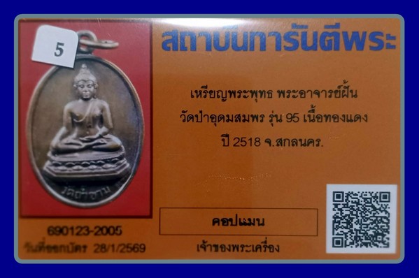 บัตรการันตี สวยมาก-800-เหรียญอาจารย์ฝั้น อาจาโร รุ่นที่ 95(พระเชียงแสน) พศ. 2518 เนื้อทองแดง