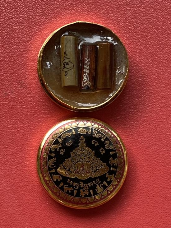 เคาะเดียวแดง สีผึ้งพระราหู รุ่น มงคลจักรวาล เนื้อ โลหะชุบทองลงยาสีดำขอบสีแดง ขนาด 3.2ซม