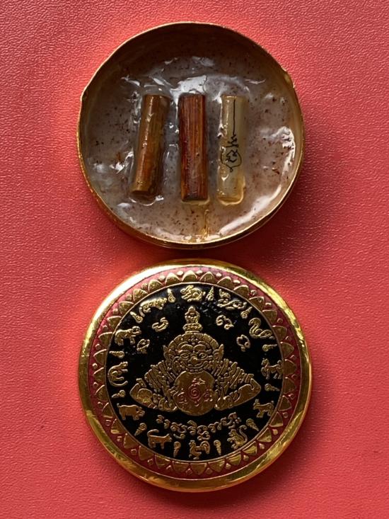เคาะเดียวแดง สีผึ้งพระราหู รุ่น มงคลจักรวาล เนื้อ โลหะชุบทองลงยาสีดำขอบสีแดง ขนาด 5ซม