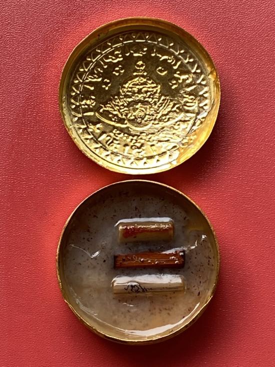 เคาะเดียวแดง สีผึ้งพระราหู รุ่น มงคลจักรวาล เนื้อ โลหะชุบทองลงยาสีดำขอบสีแดง ขนาด 5ซม
