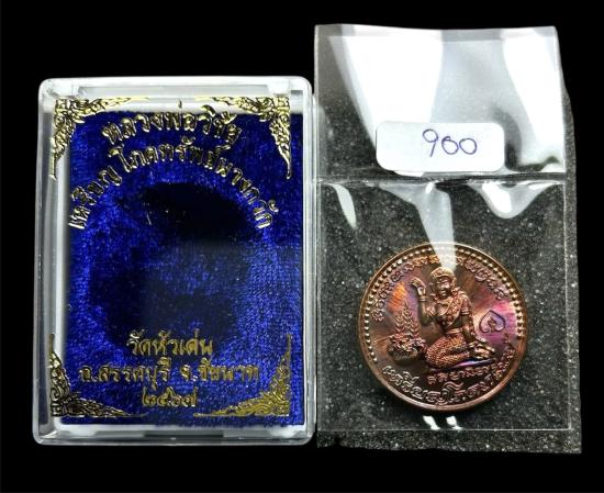 เหรียญโภคทรัพย์ "นางกวักหลังหนุมาน" หลวงพ่อวิชัย วัดหัวเด่น "เนื้อทองแดงผิวไฟ" หมายเลขสวยๆ ผิวรุ้ง