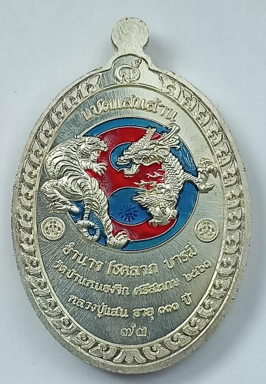 เหรียญไข่หันข้าง "8แสนล้าน" หลวงปู่แสน บ้านหนองจิก ปี61 เนื้อเงินลงยาราชาวดี พื้นแดง ลงยาเขียว/น้ำเงินจีวรเหลือง/โบว์เขียว เบอร์ 73 พร้อมกล่องเดิมครับ (เหรียญหนัก17.40 กรัม)