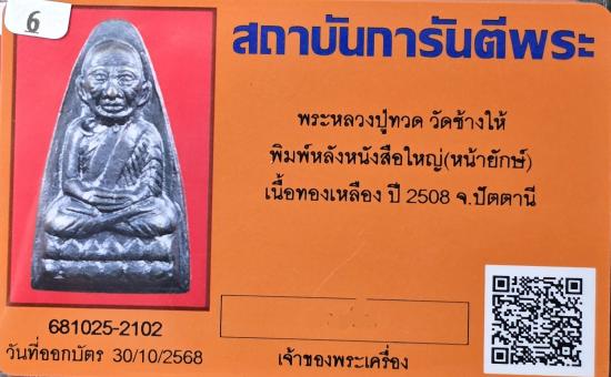 หลวงปู่ทวด หลังหนังสือ ปี2508 หน้ายัก พร้อมบัตรรับรอง